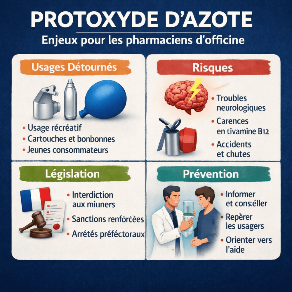Le protoxyde d’azote illustre une problématique émergente à l’interface entre produit légal et usage détourné. L’augmentation des consommations chez les jeunes, les complications neurologiques observées et l’évolution du cadre réglementaire placent les pharmaciens d’officine en première ligne de la prévention.